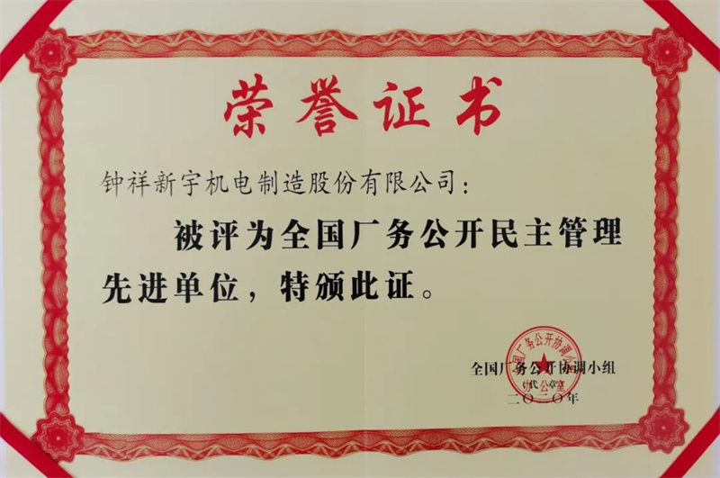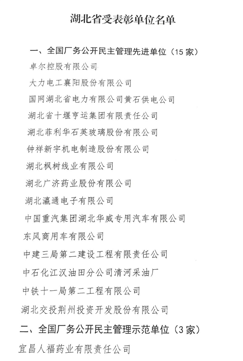 全国厂务公开民主管理先进单位每三年表彰一次,湖北省今年共计有15家企业荣获该荣誉称号,钟祥多多28机电制造股份有限公司作为 湖北省唯一的一家中小型民营制造企业榜上有名。