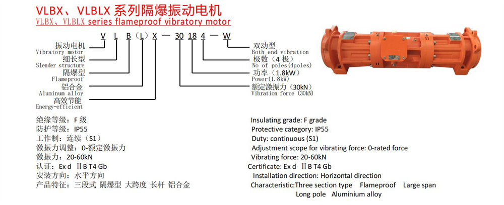 VLBL系列法兰式隔爆振动电机,功率1.3~2.4KW,4极,激振力为25~50KN,共计4个规格,广泛应用于油田、矿山、化工等行业。