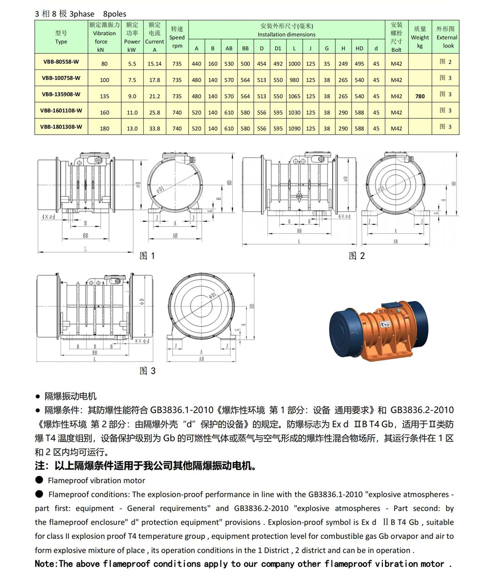 VBB系列隔爆型振动电机,功率0.2~13KW,2、4、6、8极,激振力为3~180KN,共计25个规格。